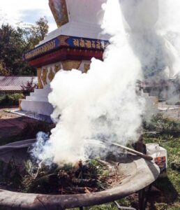We burn sang offerings in a fire. Participants can prepare their own, or offer incense, and have clean water to sprinkle..