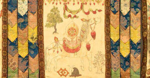 Top Image: Detail from Temple Banner with Seven Symbols of Royal Power and Offerings; Tibet; 19th century; pigments on silk, hemp rope, cotton, and ink. Rubin Museum of Himalayan Art.