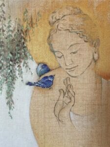 In her paintings, Buddha images are displayed in the image of emptiness, and the unpainted parts of canvas become the shape of the Buddha. Yachi thinks that the Dharma needs to be more internalized, that the Buddhas and Bodhisattvas have always been a little vague in our hearts. She believes that they need to be felt and understood internally, which is the reason why she uses relatively simple lines to depict them and invoke their clear forms for us to connect with.